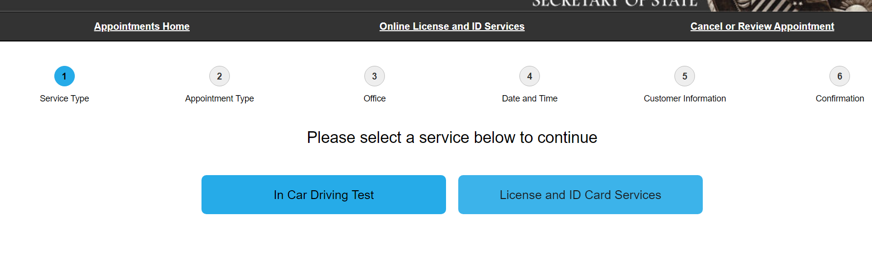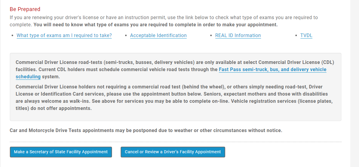 운전면허를 처음 따는 거면 이렇게 먼저 Make a Secretary of State Facility Appointment을 잡고