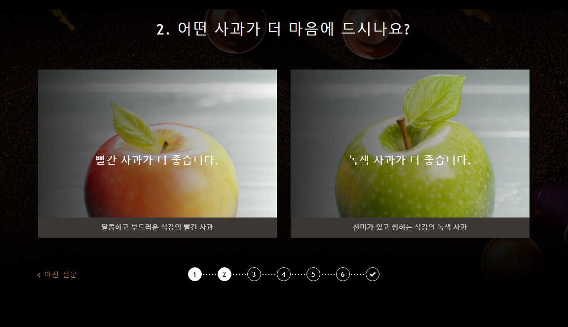 첫문제는 이렇게 어떤 디저트가 좋은지 물어본다. 개인적으로는 다크 초콜릿을 좋아하는데, 어떤 커피의 향, 텍스쳐?를 좋아하는지 물어보는 질문인것같았다.